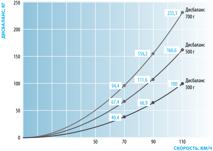 300 г неуравновешенной массы для неподвижного 90-килограммового колеса в сборе на первый взгляд не выглядят внушительно. Однако на скорости 70 км/ч эти 300 г будут создавать дисбаланс величиной 40 кг!